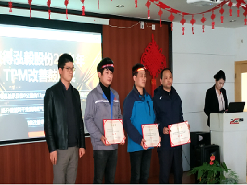 經(jīng)評選,大連嘉翔“智能制造——油壓機(jī)自動上下料單元”改善、蕪湖普威“降低車身件焊點(diǎn)毛刺”改善、博耐爾“提升M1A冷凝器外觀一次出爐合格率”改善分別榮獲一二三等獎。杰諾瑞“發(fā)電機(jī)軸承壓傷0公里由13ppm降低至0ppm”改善、泓鵠材料“提升模型烘干效果降低氣孔發(fā)生率”改善和金安世騰“安全帶拉脫”改善獲得鼓勵獎。大連嘉翔張毅榮獲泓毅股份“2021年度TPM推行優(yōu)秀管理者”稱號,杰諾瑞榮獲泓毅股份“2021年度TPM推行管理A級單位”稱號。隨后,對獲獎?wù)?獲獎單位舉行了隆重的頒獎儀式,并邀請獲獎代表上臺發(fā)言。