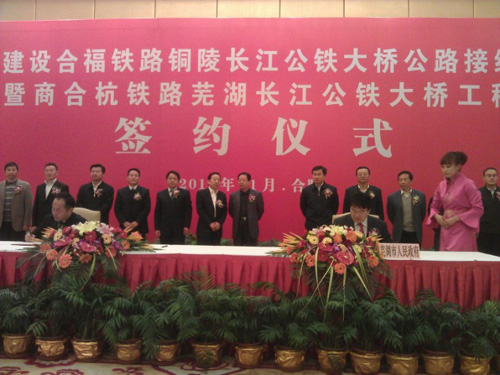 在簽約儀式上,省投資集團(tuán)公司分別與蕪湖市政府、銅陵市政府簽訂了“合作建設(shè)合福鐵路銅陵長(zhǎng)江公鐵大橋公路接線工程和商合杭鐵路蕪湖長(zhǎng)江公鐵大橋工程”框架協(xié)議;省投資集團(tuán)公司分別與蕪湖市交投公司和銅陵市交投公司簽署“合作建設(shè)合福鐵路銅陵長(zhǎng)江公鐵大橋公路接線工程合同書(shū)”。兩項(xiàng)投資協(xié)議的簽署標(biāo)志著商合杭鐵路蕪湖長(zhǎng)江公鐵大橋、合福鐵路銅陵長(zhǎng)江公鐵大橋公路接線工程兩個(gè)項(xiàng)目公司正式成立運(yùn)作,對(duì)我市實(shí)施擁江發(fā)展具有重大的戰(zhàn)略意義。